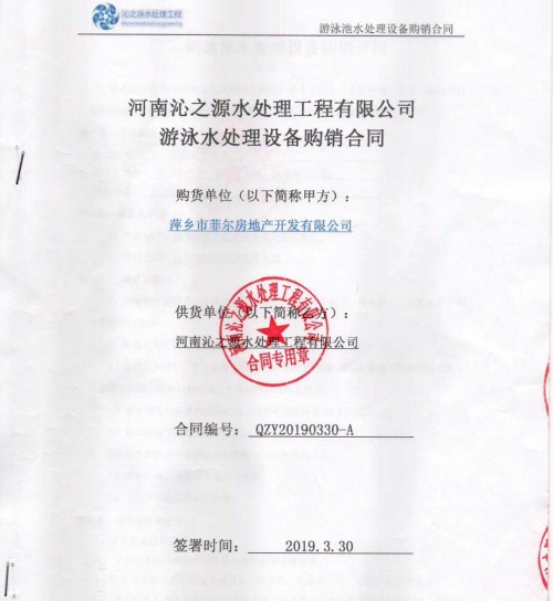 3月30日,我司業(yè)務(wù)團(tuán)隊(duì)從江西萍鄉(xiāng)傳來(lái)捷報(bào)---我司于2019年3月30日上午吉時(shí)09:18分與江西萍鄉(xiāng)菲爾房地產(chǎn)開(kāi)發(fā)有限公司成功簽約1034方室外無(wú)邊際泳池水處理工程項(xiàng)目。
